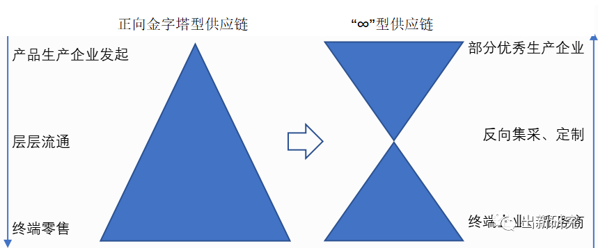 而隨著產能過剩,市場進入供大于求時代,買方話語權在逐漸提升,同時為了解決產品差異化問題,買方對供給的結構也提出了新要求,這是產業互聯網系統性機會的來源。經過產業互聯網企業的改造,產業鏈結構會發生巨大變化,供應鏈從金字塔型向“∞”型轉變,市場的利益結構和生態結構發生巨大變化。