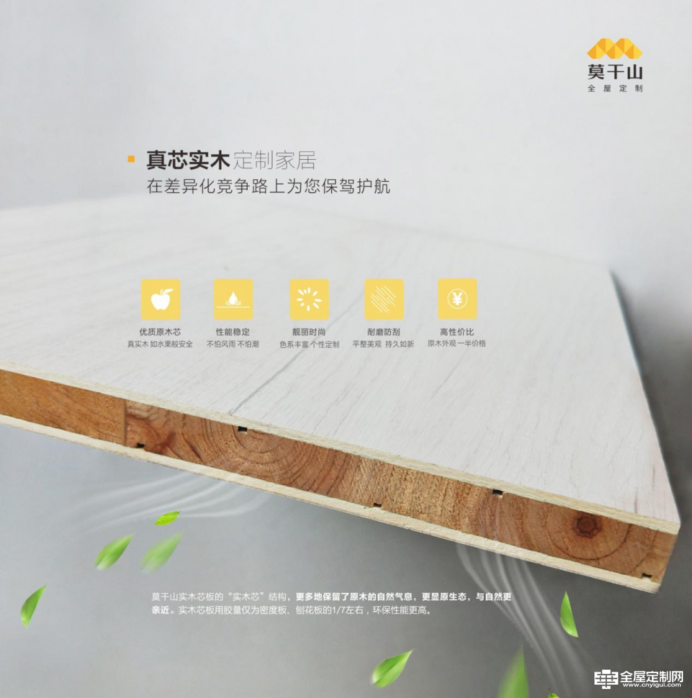 莫干山大家居產品線齊全,覆蓋了全屋定制需求端的所有產品,從整木、地板、木門、墻面裝修的木飾面到立面收納的衣柜、櫥柜、書柜、酒柜,再到用戶生活空間的高效利用方案如榻榻米、隔斷柜、陽臺柜等,一應俱全。持續立足于特色實木芯產品,推出多彩實木、真芯實木、幻影實木等系列,在滿足消費者的原木情節的基礎上,合理平衡原木產品的性價比、物理變形特性及加工難點等因素,開創了定制家居領域又一新的細分市場,也是業內唯一實現生態板工業化大批量定制的企業。