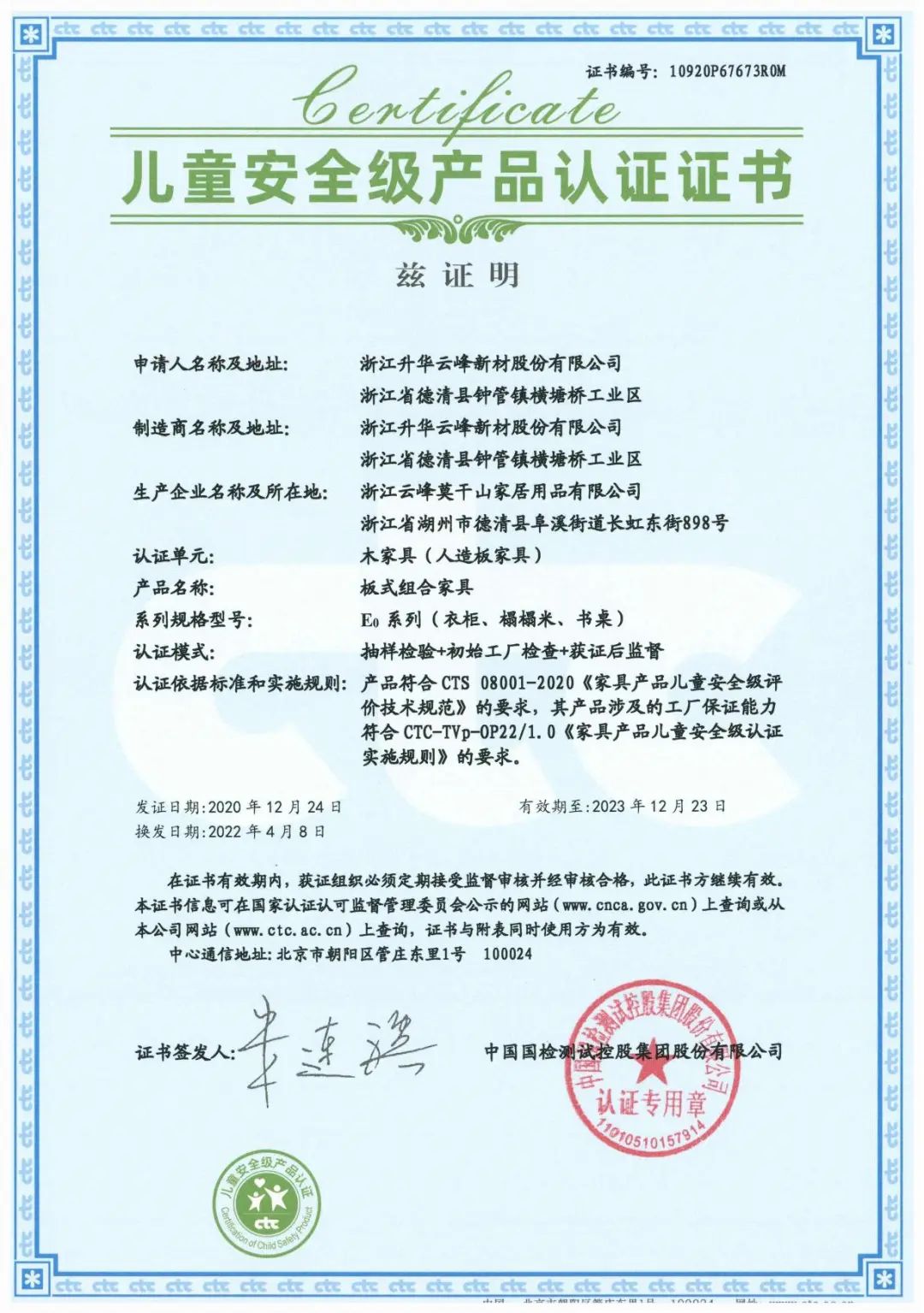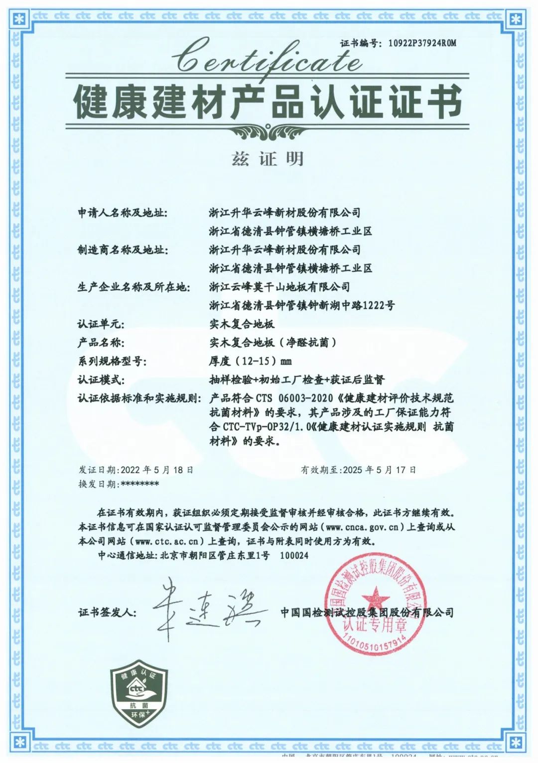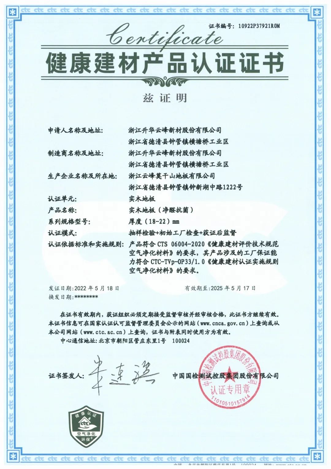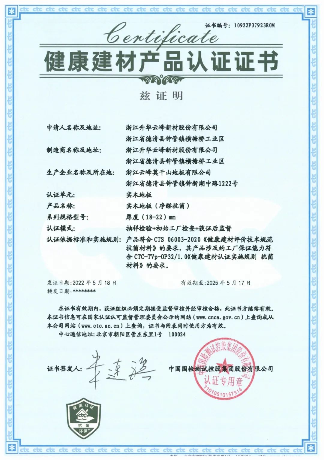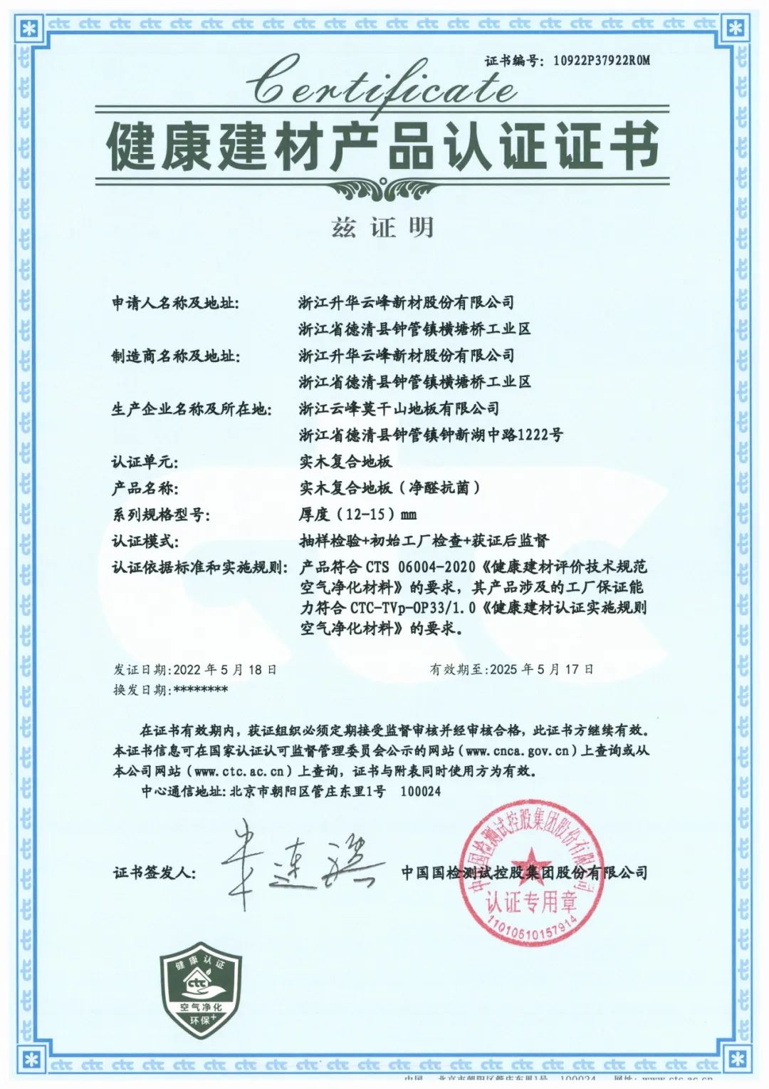 2022年,莫干山板式組合家具再次榮膺“兒童級(jí)產(chǎn)品認(rèn)證證書”和“CTC產(chǎn)品自愿認(rèn)證年度監(jiān)督合格通知書”雙重認(rèn)證。同時(shí),浸漬紙層壓木質(zhì)地板、實(shí)木復(fù)合地板、實(shí)木地板也相繼獲得了“兒童級(jí)產(chǎn)品認(rèn)證證書”,其中實(shí)木復(fù)合地板和實(shí)木地板更是以其在抗菌、空氣凈化功能上的優(yōu)勢(shì)強(qiáng)勢(shì)突圍,將“健康建材產(chǎn)品認(rèn)證證書”收入囊中。這既是對(duì)莫干山大家居品質(zhì)的高度認(rèn)可,也證明了莫干山的綠色環(huán)保實(shí)力再上新臺(tái)階。