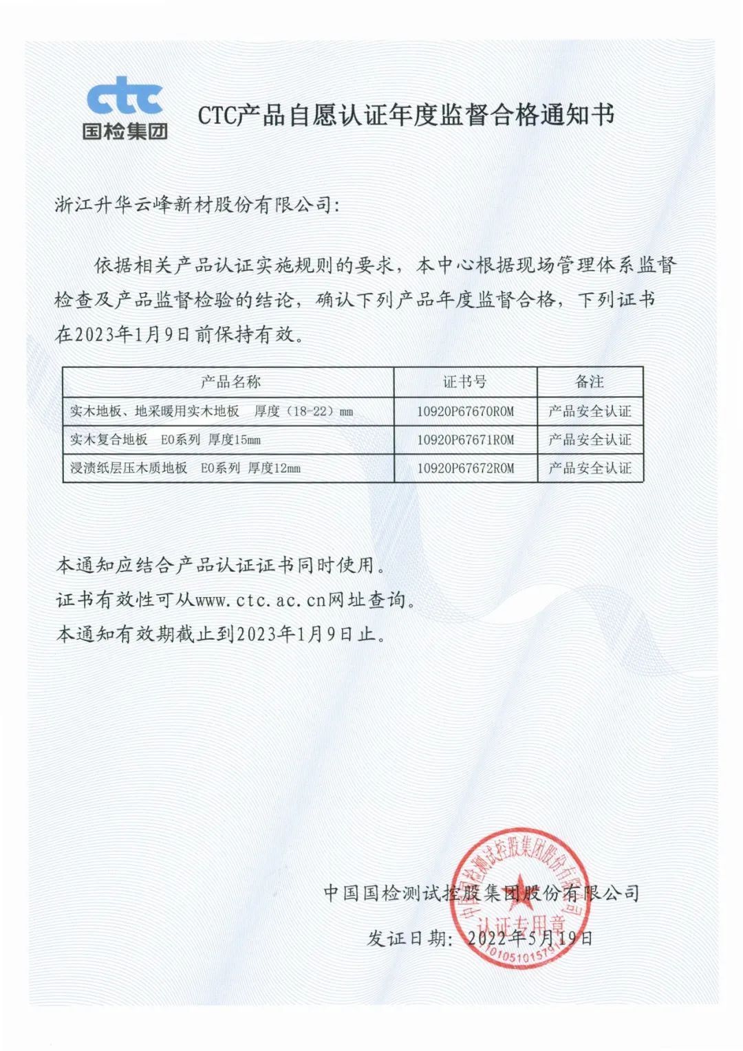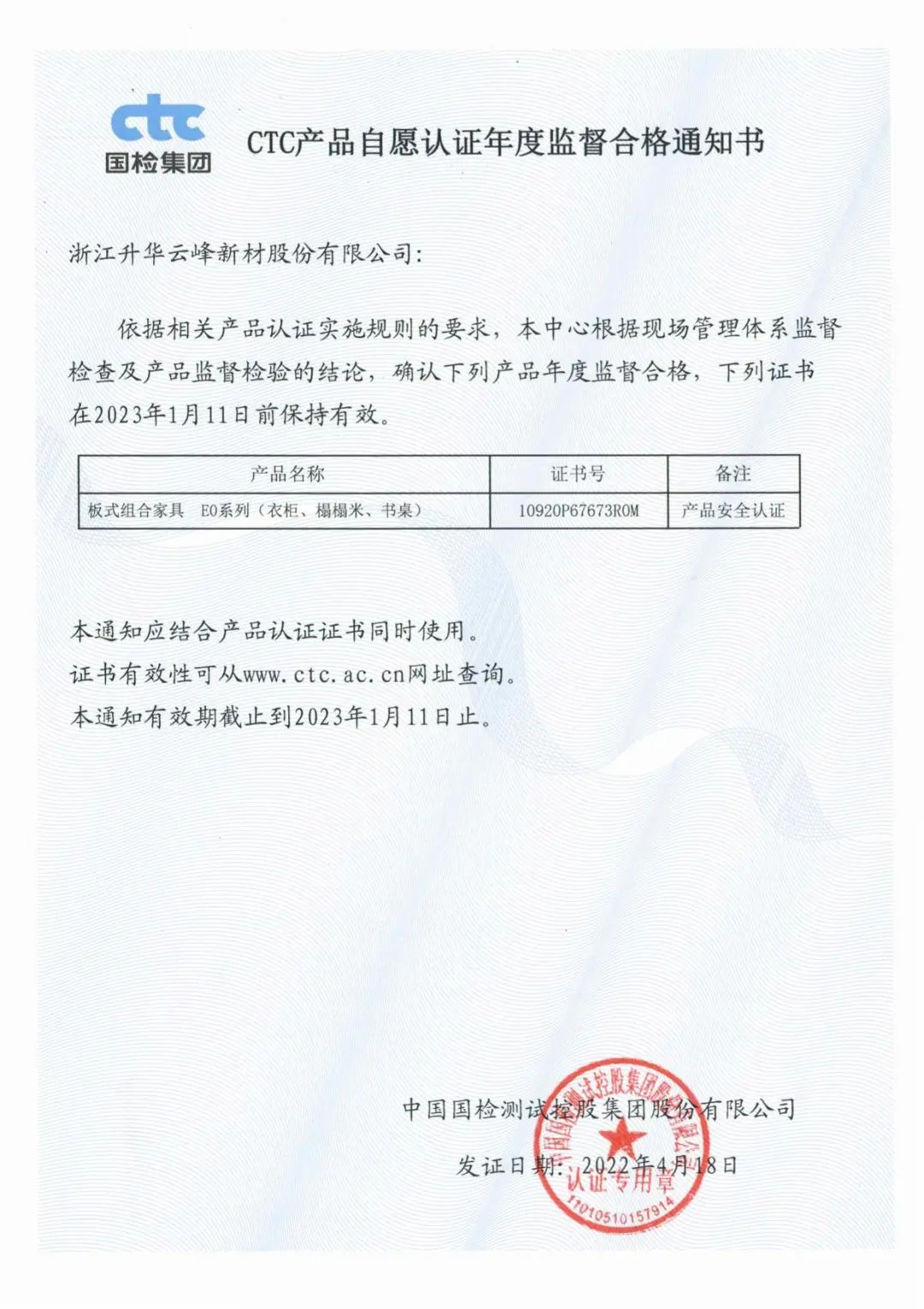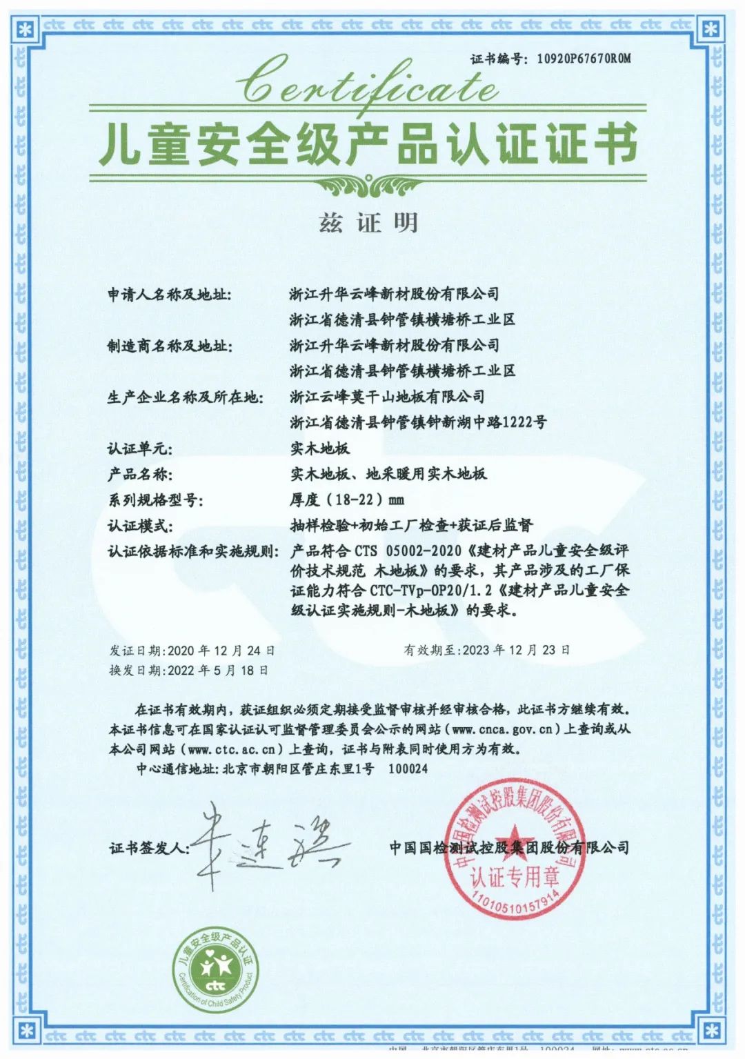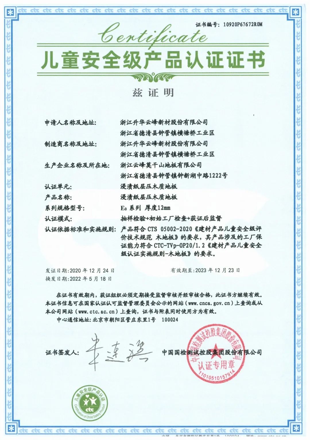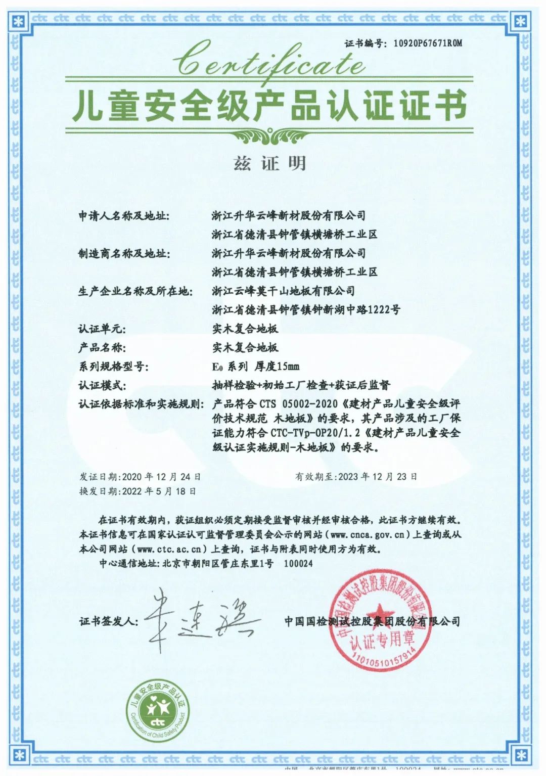 2022年,莫干山板式組合家具再次榮膺“兒童級(jí)產(chǎn)品認(rèn)證證書”和“CTC產(chǎn)品自愿認(rèn)證年度監(jiān)督合格通知書”雙重認(rèn)證。同時(shí),浸漬紙層壓木質(zhì)地板、實(shí)木復(fù)合地板、實(shí)木地板也相繼獲得了“兒童級(jí)產(chǎn)品認(rèn)證證書”,其中實(shí)木復(fù)合地板和實(shí)木地板更是以其在抗菌、空氣凈化功能上的優(yōu)勢(shì)強(qiáng)勢(shì)突圍,將“健康建材產(chǎn)品認(rèn)證證書”收入囊中。這既是對(duì)莫干山大家居品質(zhì)的高度認(rèn)可,也證明了莫干山的綠色環(huán)保實(shí)力再上新臺(tái)階。
