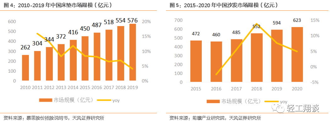 軟體家具:根據(jù)前瞻產(chǎn)業(yè)研究院數(shù)據(jù),2020年沙發(fā)行業(yè)規(guī)模約為623億元,保守假設(shè)行業(yè)規(guī)模維持平穩(wěn),2020年顧家、敏華內(nèi)銷沙發(fā)市占率分別為5%、6%。根據(jù)慕思股份招股說明書,2019年床墊行業(yè)規(guī)模576億元,保守假設(shè)行業(yè)規(guī)模維持平穩(wěn),2020年喜臨門、慕思內(nèi)銷床墊市占率分別為4%、7%。