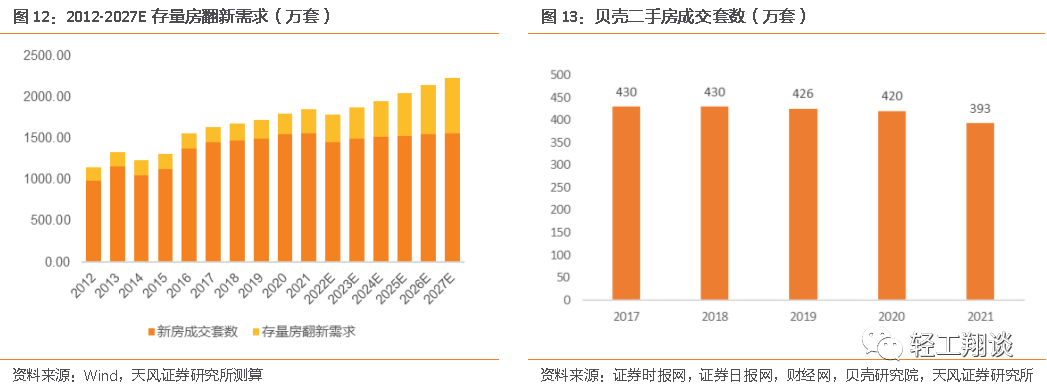 根據(jù)貝殼研究院數(shù)據(jù),全國二手房年平均交易量約為400萬套,占住房交易的20%,二手房交易熱度和房價(jià)相關(guān)性更高,而存量房更新需求和房齡及消費(fèi)能力更相關(guān),和居民對(duì)品質(zhì)住房的要求更相關(guān)。根據(jù)貝殼研究院數(shù)據(jù),2021年全國二手房成交套數(shù)約393萬套,同比下滑約6.4%,近幾年年平均二手房成交套數(shù)約為400萬套左右,假設(shè)新房銷售套均面積為100平米/套,2021年全國新房和二手房銷售套數(shù)合計(jì)將近2000萬套,二手房交易占比約20%。