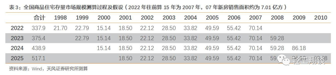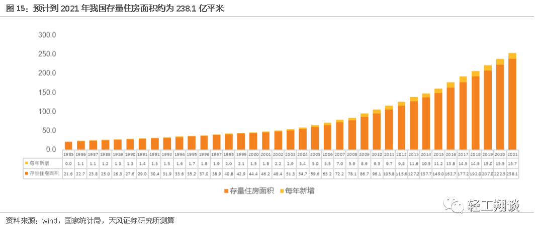 每年存量更新需求:2022-2025年城鎮(zhèn)商品住宅存量翻新套數(shù)預(yù)計(jì)分別為338、375、439、517萬套。假設(shè)存量商品房15年翻新一次,每年翻新比例為10%,平均住宅面積為100平米/套。