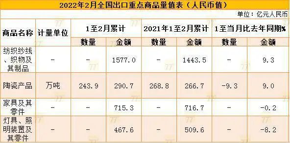 3月7日,中國海關總署發布前2022年1-2月進出口情況。據海關統計,2022年前2個月: 家具及其零件出口額為715.3億元,同比下降0.2%; 陶瓷產品出口額為290.7億元,同比增長9%; 燈具、照明裝置及其零件出口額為467.6億元,同比下降8.2%; 紡織紗線、織物及其制品出口額為1577億元,同比增長9.3%。 此外,運力的影響和運費的高漲,大宗商品、原材料的上漲,還有人民幣匯率升值的壓力,勞動力成本的提高,都是外貿企業碰到的“困難”,特別是中小企業更加困難。 就總體形勢來看,今年前2個月,中國進出口總值6.2萬億元,比去年同期增長13.3%。其中,出口3.47萬億元,增長13.6%;進口2.73萬億元,增長12.9%;貿易順差7388億元,增加16.3%。 另外,值得關注的是,今年前2個月,歐盟重新超過東盟成為中國第一大貿易伙伴。與此同時,中國與RCEP貿易伙伴合計進出口1.85萬億元,同比增長9.5%。隨著RCEP制度紅利的逐步釋放,RCEP成員經貿發展成效將進一步顯現。 展望未來,分析師表示,考慮海外供應鏈瓶頸或將改善,中國的供給替代效應將減弱,出口增速大概率趨緩。此外,受到烏克蘭局勢等因素影響,后續我國出口預計將面臨一定的不確定性。 編輯202202