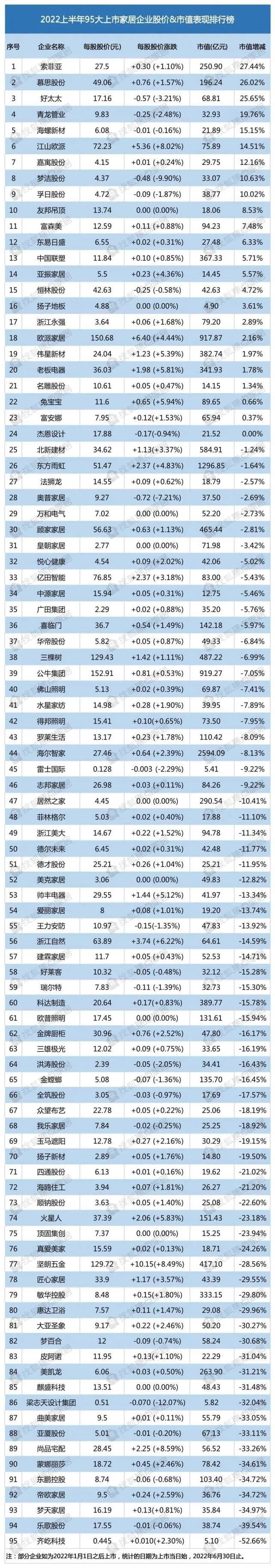 包括賣場、木門、家具、定制、地板、家裝、照明、瓷磚、衛浴、廚電等細分行業在內,截止2022年6月30日股市收盤,搜狐焦點家居針對95家上市建材家居企業,從市值和股價兩個維度進行分析。