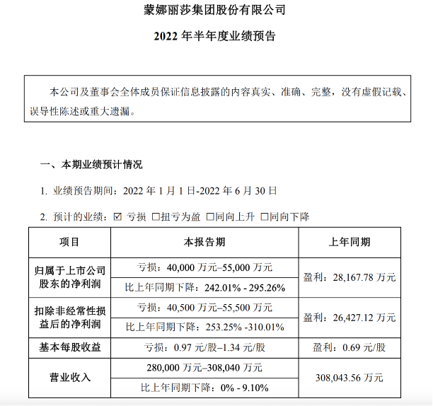 值得一提的是,多家企業由盈轉虧,其中蒙娜麗莎預估虧損為4億元至5.5億元,據了解,蒙娜麗莎因為國內疫情反復,部分房地產客戶信用風險增加,導致公司整體營業收入略有下降。