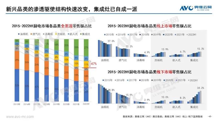2022年上半年,中國家電市場(不含3C)規模3389億元,同比下滑9.3%;廚電市場(煙灶消洗嵌集)整體規模453億元,同比下滑1.7%;集成灶規模124億元,同比增長9.6%。