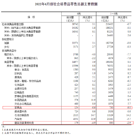 7月15日,國家統計局發布2022年1-6月國民經濟運行情況。數據顯示,2022年上半年,家具類零售總額為730億元,同比下降9%;建筑及裝潢材料類零售總額為880億元,同比下降2.9%。其中,6月份,家具類零售總額為154億元,同比下降6.6%;建筑及裝潢材料類零售總額為179億元,同比下降4.9%。