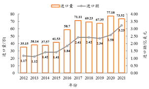 圖1 2012—2021年我國刨花板類產品進口量和進口額