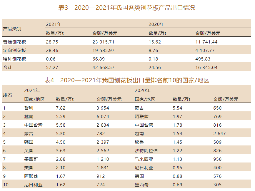 由于國內外刨花板產業發展變化及國際新冠肺炎疫情影響,2021年我國刨花板進出口貿易較往年發生明顯變化。2021年我國刨花板貿易雖仍以進口為主,但進口量有小幅下降,進口金額和平均單價增長顯著;2021年我國刨花板出口勢頭強勁,出口量和金額較上年同期大幅上漲,創下近10年來新高。隨著國內刨花板生產技術的不斷提升,優質刨花板產能增加,未來我國刨花板的出口潛力長期看好。