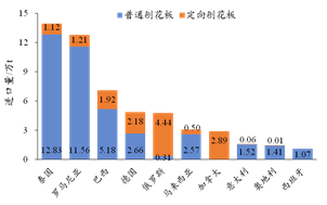 按進口額統計,2021年我國進口刨花板類產品3.23億美元,同比上漲25.2%,其中從羅馬尼亞、泰國、巴西、德國、俄羅斯5國進口的刨花板金額合計為1.79億美元,占刨花板進口總額的55.4%。從羅馬尼亞進口的刨花板金額為0.67億美元,同比上漲20.3%,位居第1;從泰國、巴西、俄羅斯、加拿大、意大利、馬來西亞進口的刨花板金額分別下降了21.3%、34.3%、1.8%、14.4%、7.9%、57.6%,分別位居第2、4、5、6、7、9位;從德國、奧地利、西班牙進口的刨花板金額分別上升了38.9%、57.8%和48.6%,分別位居第3、8、10位。