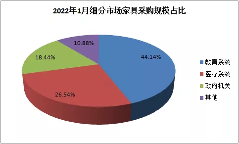 從全國家具采購細分市場來看,2022年1月教育系統(tǒng)家具采購,占全國家具采購規(guī)模44.14%,采購規(guī)模逾45348.82萬元,位居榜首。其次是醫(yī)療系統(tǒng)領(lǐng)域家具采購規(guī)模,占全國家具采購規(guī)模26.54%;政府機構(gòu)領(lǐng)域家具采購規(guī)模排名第三,占全國家具采購規(guī)模18.44%;最后是其他領(lǐng)域家具采購規(guī)模,占全國家具采購規(guī)模10.88%。