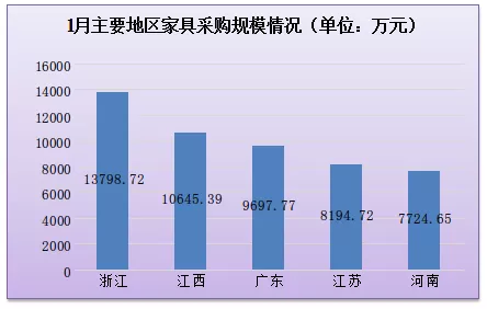 其中,在單項家具采購金額突破1千萬元的項目中,浙江家具采購項目數(shù)量占了近三成,因此,推動了該地家具采購總金額增長,其家具采購總金額排名由2021年12月的第八名躍升至2022年1月第一名,以家具采購總金額13798.72萬元拔得全國家具采購總金額排名頭籌。