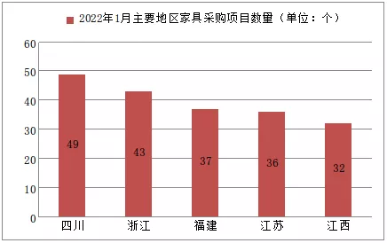 從全國家具采購項目數(shù)量來看,2022年1月全國家具采購項目總數(shù)量逾444個,就地域分布,排名前五的地區(qū)依次是四川、浙江、福建、江蘇和江西,項目數(shù)量依次為49個、43個、37個、36個和32個,其中四川以零星家具采購項目居多,領(lǐng)跑全國家具采購項目數(shù)量。