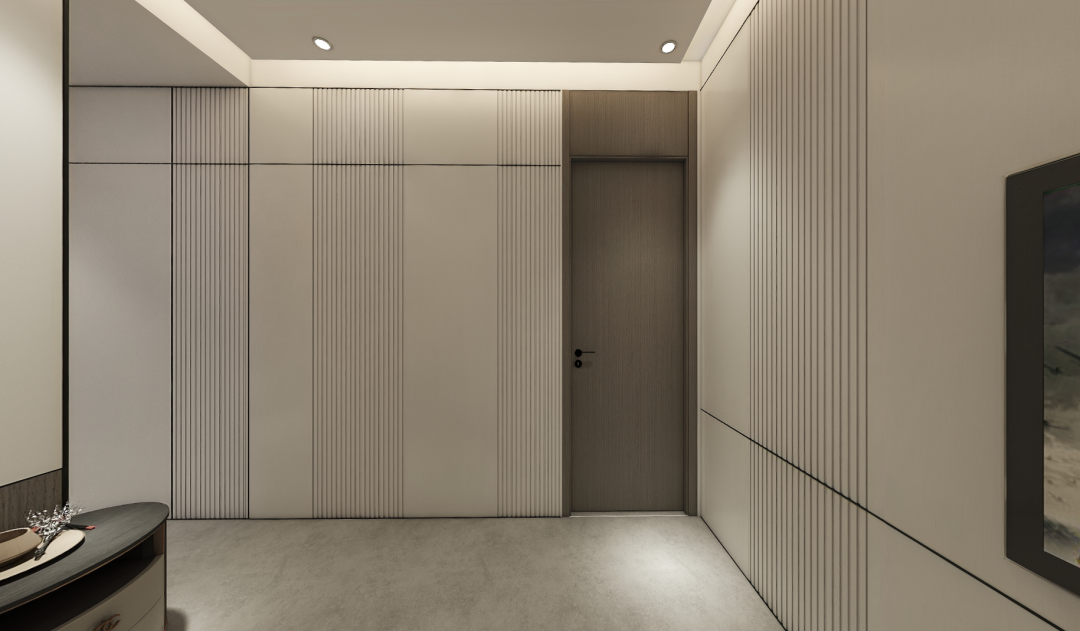 盈康世家可定制門墻一體化的設計,低調高級的莫蘭迪格柵+墻板與木門同色設計,極盡簡約,將空間的格調與舒適感拉滿~