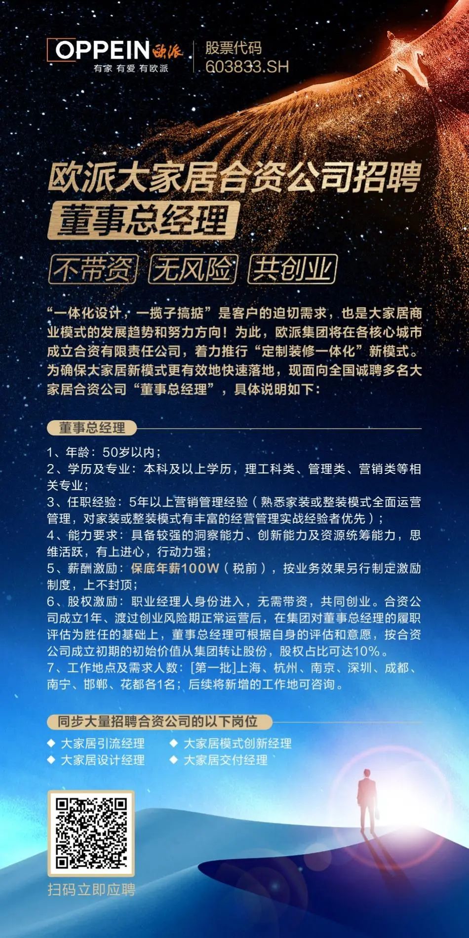 為實(shí)現(xiàn)該目標(biāo),歐派也正面向全社會招聘董事總經(jīng)理,以優(yōu)異的薪資、股權(quán)激勵(lì)、完善的培育路徑,為賢才提供行業(yè)上乘的施展平臺。“群之所為事無不成,眾之所舉業(yè)無不勝?!比瞬攀菄医?jīng)濟(jì)社會發(fā)展的第一資源,對公司亦然,此次廣納賢才,無疑是歐派身處后地產(chǎn)時(shí)代駛向新彼岸的戰(zhàn)略之策,也有望為社會培育新一批家居行業(yè)的領(lǐng)先人才。