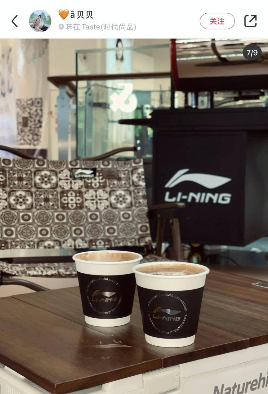 透過一位小紅書博主的打卡帖子,我們看到了寧咖啡的廬山真面目。今年2月初,她在廣東湛江市一家新開的李寧專賣店門口,看到了標有“LI-NING”標識的咖啡小推車,車篷上印有李寧品牌logo和“X CAFE”的字樣。帖子中她提到,在李寧門店任意消費都可以免費喝一杯李寧咖啡,杯子的logo也是常見的李寧品牌樣式,很有氛圍感。