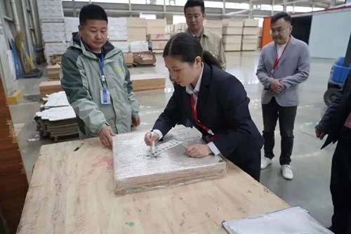 本次北方生產基地之行,莫干山板材走訪工廠,現場裁樣,執行封樣送檢。從外觀合格率至理化指標,從原材料至成品,層層把關,嚴檢板材各項數據。
