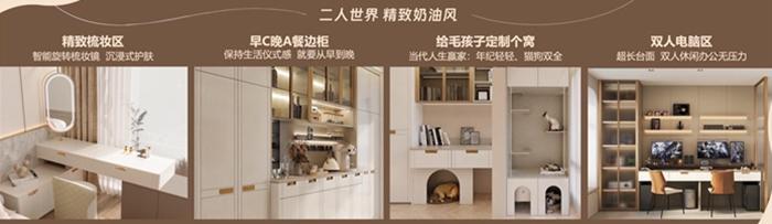 晨光奶咖——屬于二人世界的精致空間,親密無間中劃分出各自的愜意與自在,還少不了氛圍感與儀式感的充分營造。2023小紅書家居最火爆風格“輕法奶油風”,整體奶白主色調(diào),采用簡約輕法式門型,時光菱格背板點綴吸睛,柔和弧度轉(zhuǎn)角,搭配全屋同色系及柔軟家具,目之所及皆是溫柔。智能旋轉(zhuǎn)梳妝鏡,打造沉浸式護膚的精致梳妝區(qū);早C晚A餐邊柜,保持生活儀式感;專屬定制寵物窩,共享美好時光;雙人電腦區(qū)超長臺面,讓休閑辦公都自得其樂。